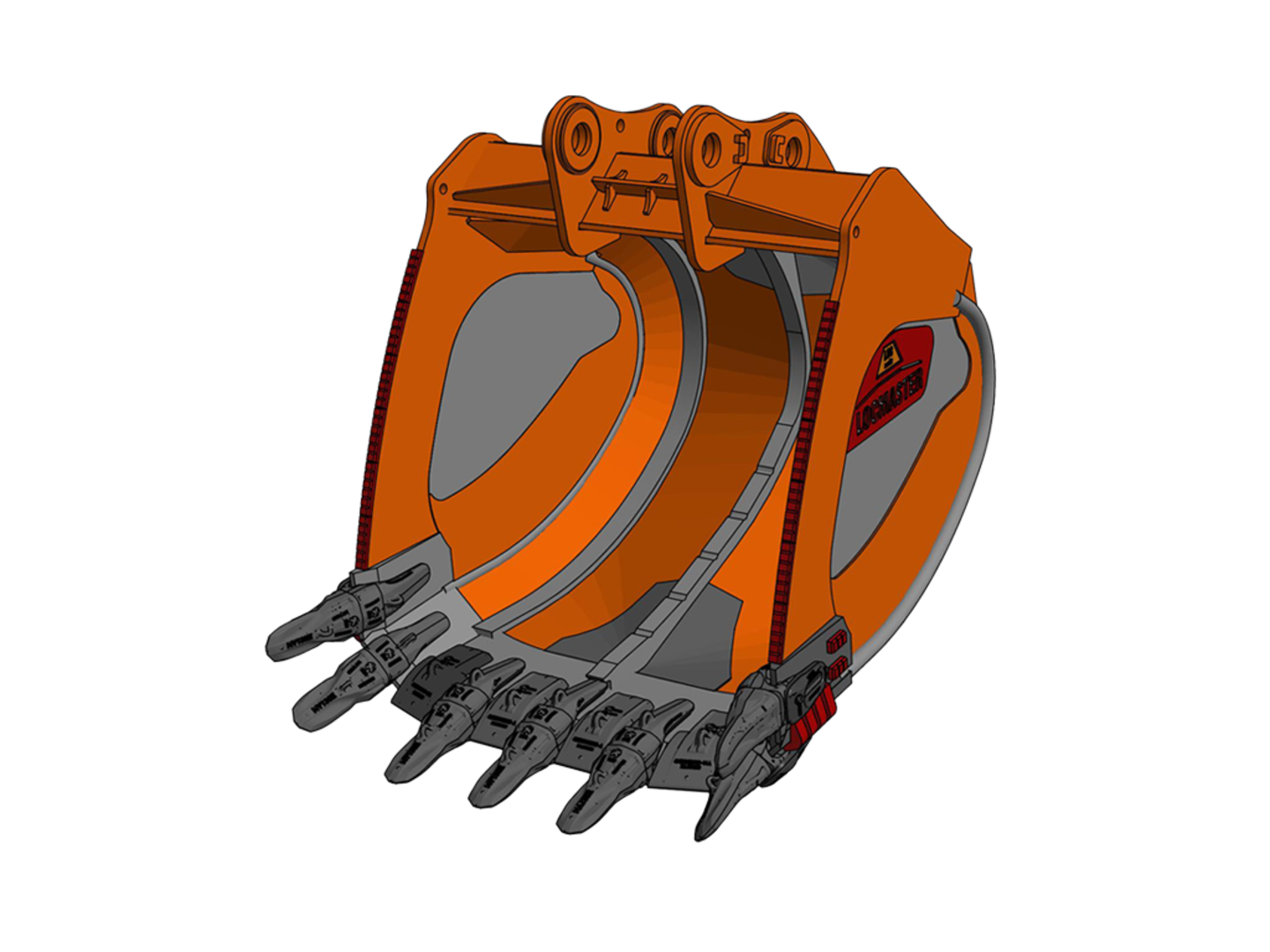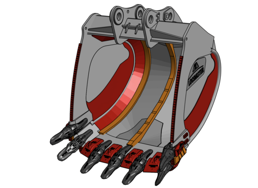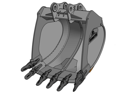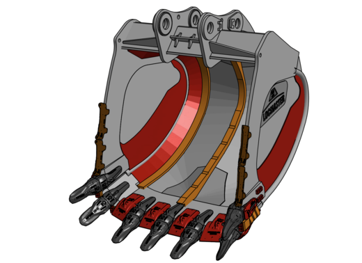 Seitenteilverstärkung mit Fallkugelausstattung, Verschleißkufe mit ChockBlocks, Messer-Eckenschutz, Chock-Block Ausstattung, Schrägboden verstärkt, Verschleiß- schutz Boden außen, Zahnhalter unten HD-Kappen und mech. wechselbarer Messerschutz
