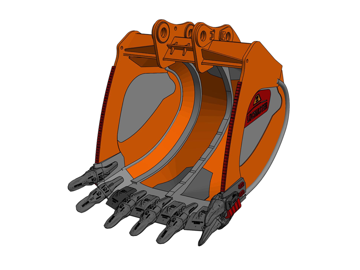 Seitenteilverstärkung mit Fallkugelausstattung, Verschleißkufe mit ChockBlocks, Messer-Eckenschutz, Chock-Block Ausstattung, Schrägboden verstärkt, Verschleiß- schutz Boden außen, Zahnhalter unten HD-Kappen und mech. wechselbarer Messerschutz
